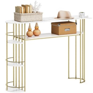 This gold MDF+metal C-shaped console table features a sleek, modern design. Compact and lightweight, it slides easily under sofas or beds, perfect for living rooms or bedrooms as a side table for snacks or drinks.