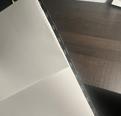 - Monthly spreads have unruled daily blocks and a column for notes. Pages are tabbed for easy navigation.