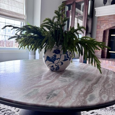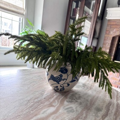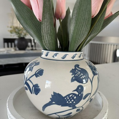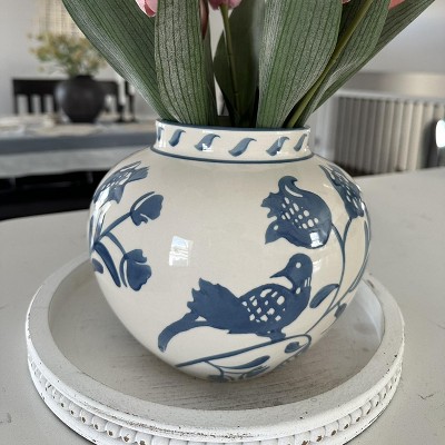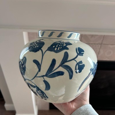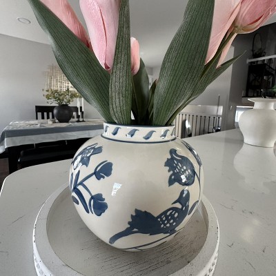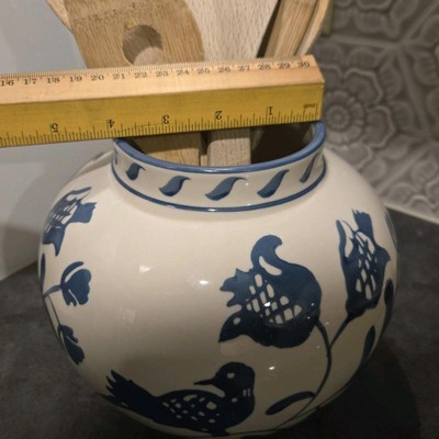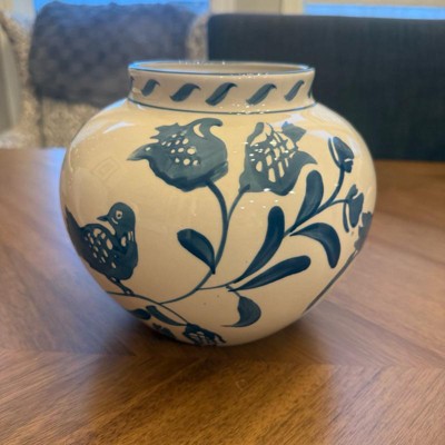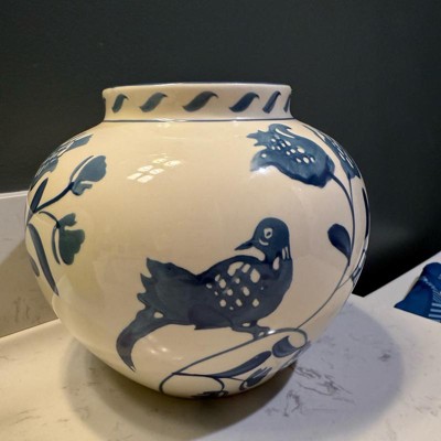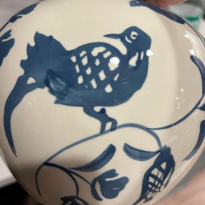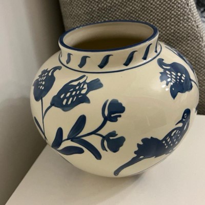 [This review was collected as part of a promotion.] I love this vase. It’s the medium vase in the painted vase collection. It pairs so well with the larger vase. It has the same blue painting that make it look handmade. This vase features birds sitting on branches. It’s about half the size of the larger painted vase. It’s made of a heavy ceramic. It looks so high end!