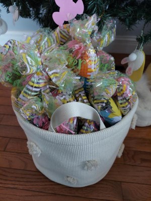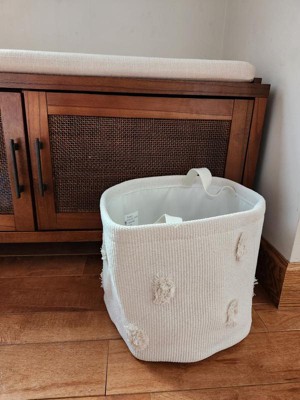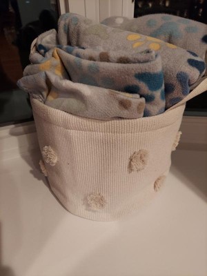 Keep your baby's room organized and tidy with this Medium Decorative Basket from cloud island™. This decorative storage basket features a cream woven construction adorned with circular fuzzy texture for fun style. Designed with attached handles for easy portability, this round medium-size basket is great for stowing toys, baby blankets, diapers, baby clothes and other essentials, and is easy to spot clean.