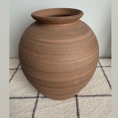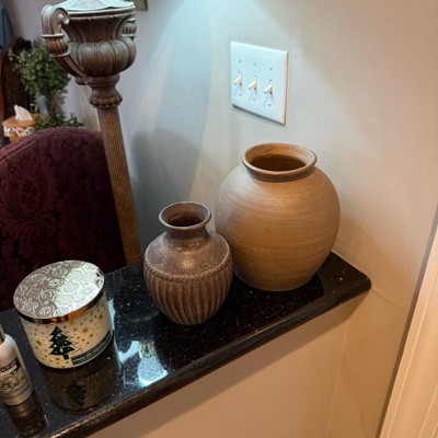 [This review was collected as part of a promotion.] This vase is medium in size and is rustic in its style. The texture of this vase is rough to the touch. The color is two shades of brown, which is kind of a streaky look that goes around the circumference of the vase but looks very nice. I also have a smaller vase that has a pattern to it that I coupled it with and I think it looks very nice together. I need to add some dried flowers to my medium size vase to add some height to it to make the pairing look more balanced.