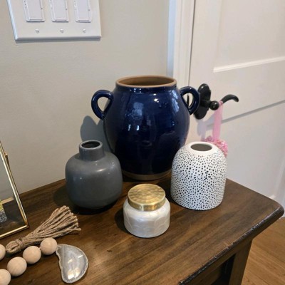 Bring a pop of color and style to your space with these Tuscan Ceramics from Threshold™. This decorative collection features a large handled vase, an extra-large vase and a medium handled vase in three different sizes. Each ceramic piece features a rich indigo-blue shade with earthy brown accents on the tops and bases for a striking two-tone look. With a watertight construction, these vases are great for displaying fresh or faux flowers.