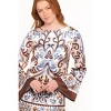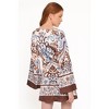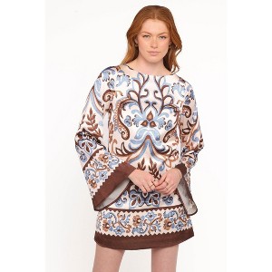 Elevate your wardrobe with the Megan Mini Dress in stunning Ivory Brown Blue. The flattering boat neckline creates a timeless silhouette that highlights your collarbones, while the dramatic long flare sleeves add movement and visual interest with every gesture.