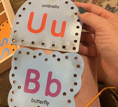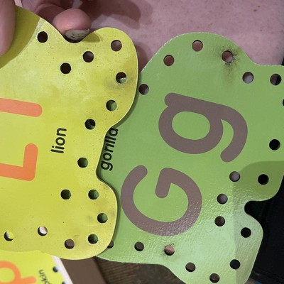 Practice your letters and build fine motor skills at the same time! This value-packed learning set has a shaped lacing board for every letter of the alphabet. Each one features a colorful illustration on one side and a label on the back, complete with oversize uppercase and lowercase letters. Use the cards as flashcards, match the lace colors to the borders, or string together the entire alphabet—there are lots of ways to learn and play!