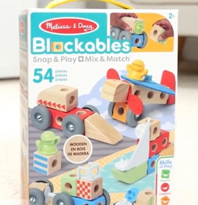 [This review was collected as part of a promotion.] Blockables are linkable, stackable, and playable! The solid wood connect-and-play building blocks are perfect manipulatives to help preschoolers two and older boost developmental skills (fine motor, problem-solving, matching, storytelling, and self-esteem), while using their imaginations and having fun. Easy-to-grasp smooth, colorful wooden blocks fit together in a snap with large connectors that even little hands can push in and pull out. An illustrated guide shows how to arrange and link the Blockables to create multi-textured "things that go" (a sailboat with felt sail, airplane with felt propeller and wings, tractor with trailer, and race car), or kids can use their imaginations to mix, match, and combine pieces to make unique creations and play their own way! Kids can easily expand their collection -- the 54-piece Vehicles Play Set is compatible with all other Blockables play sets. The packaging folds out to convert into a fun play space and pieces store in the sturdy corrugated box with a soft handle for easy cleanup and portability. Patent pending.