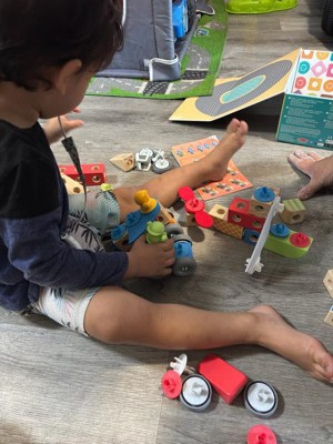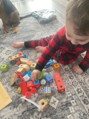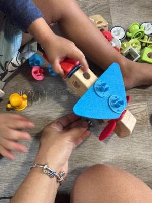 [This review was collected as part of a promotion.] fantastic blend of creativity and construction fun. The chunky, easy-to-handle pieces are perfect for little hands, encouraging imaginative play and fine motor skills. Kids will love mixing and matching the vehicle parts to create their own custom cars and trucks. The durable wood construction holds up well to active play, and the bright, colorful designs keep children engaged.