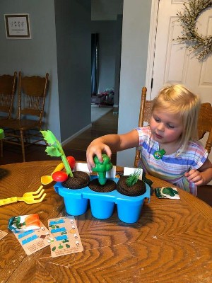 - Includes planting tray, 3 sponge soil inserts, play seeds in packets, carrot, broccoli with removable leaves, tomato plant with tomatoes to pick, trowel, cultivator, watering can, reusable planting and care checklists, collectible medallion