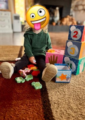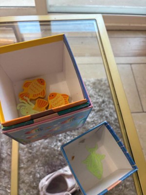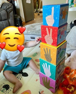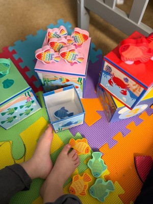 [This review was collected as part of a promotion.] We really like the these Ms. Rachel blocks because the blocks themselves are a hard cardboard so they’re very sturdy. They’re also very colorful, with each side having a different image. My 2 year old had fun trying to stack the blocks on top of each other, as well as nesting them inside. He also enjoyed trying to match the colored fish into the designated boxes so I feel that this will definitely be educational for when he’s older as well. I think it’s a great set for learning, but I was a little worried because the fish are small and a hard wood. Even though they’re not tiny enough to be a chocking hazard, they still made me nervous for a baby who puts everything in their mouth. Also, I felt that the toy was lacking the sensory experience it mentioned having. From the blocks the fish, everything was the same texture - very hard. I wish the fish had more details like soft bumpy or shiny sequins for the scales to make them more interesting and safer on their hands and mouths.