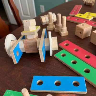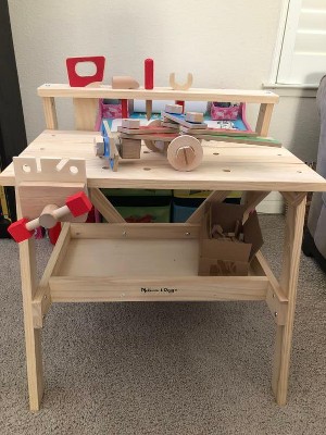 Very cute workbench! My 2 year old loves playing with the wooden pieces. Husband said it was easy to assemble but did take about an hour. Only recommendation: comes with just enough pieces to build items in the model kit instructions so if something is lost or misplaced you might not be able to make all the builds. Buy the take along tool box for extra parts.