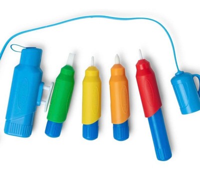 Discover new ways to color with water on any Melissa & Doug Water WOW! color-reveal activity pad or surface! Four chunky water pens – three with standard-sized reservoirs and one extra-large -- and a water sprayer are easy for little hands to hold and have different tips for creating unique fun designs. Two standard tips, a calligraphy tip, and a wide brush are interchangeable with the reservoirs. A specially designed cap fits any of the pens and includes a stretchy tether that easily attaches to any Water WOW! activity pad’s spiral binding (Water WOW! pad not included). Water WOW! arts and crafts are a reusable, mess-free way to color: Activity pages are white when dry, and reveal colors, pictures, and shapes when wet. Let the pages dry to erase, then color with water using the pens or sprayer again and again!
