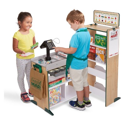 KID-SIZED GROCERY STORE: Melissa & Doug’s freestanding, sturdy wooden grocery store includes a hand-cranked conveyor belt, a bagging area, card swipe machine, a realistic beeping scanner, and cash drawer.CREATIVE PLAYTIME: This wooden grocery store is designed to inspire customers three and older to browse the shelves and pay for purchases on one side, while on the other side, the grocer rings up items.DESIGNED FOR MAXIMUM SAFETY: Our kids play kitchen includes ample shelving on both sides for display and storage. It has been designed with smooth, curved corners and edges for improved safety.GREAT GIFT FOR AGES 3 AND UP: This grocery store makes a great gift for kids ages 3 and up. To round out the pretend play shopping experience, consider adding the Melissa & Doug Fresh Mart Grocery Store Companion Collection.“THE GOLD STANDARD IN CHILDHOOD PLAY”: For more than 30 years, Melissa & Doug has created beautifully designed imagination- and creativity-sparking products that NBC News called “the gold standard in early childhood play.”100% HAPPINESS GUARANTEE: We design every toy to the highest quality standards, and to nurture minds and hearts. If your child is not inspired, give us a call and we'll make it right. Our phone number is on every product!