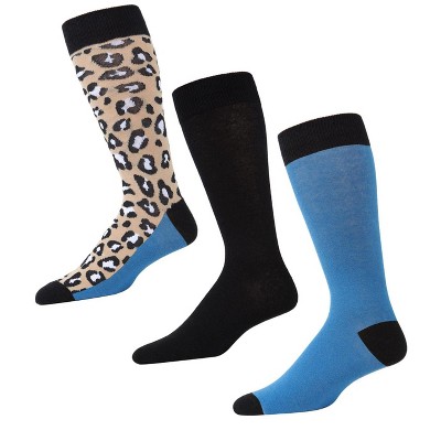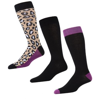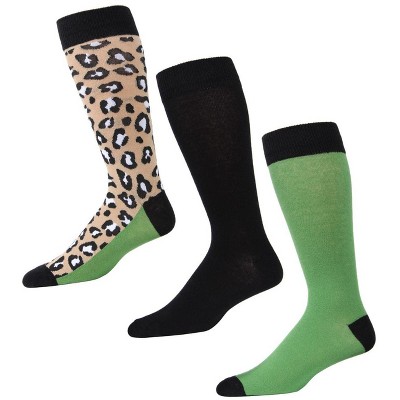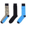Roar! Our Leopard Pane Crew 3 Pack is a tame way to embrace your wild side. 3 adventurous socks come together in this pack: one sock with a leopard pattern on top and a solid color sole, one solid color sock, and one sock with a contrasting heel, toe, and cuff. Mixing and matching is encouraged. This 3-pack comes in five sets, so if you get all, you have a whole collection of socks. Go on a safari without leaving the house.
