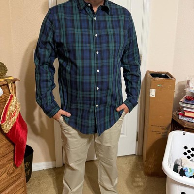 Add a classic, easygoing look to your seasonal wardrobe with this Plaid Holiday Shirt from Goodfellow & Co™. Designed in a standard fit, this long-sleeve shirt is crafted from cotton, nylon and spandex blend woven fabric to keep you moving through the day in absolute comfort. The collared neckline and button-down front add a polished touch, while the front chest pocket adds functional detail to your look.