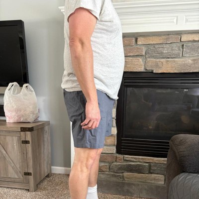My husband normally wears a size 34 or large in pants. We bought these in a size 34 and they fit perfectly. The length was just right, hitting about mid thigh. He found them to be very comfortable- easy to move and squat down in which is important when chasing after our toddler! We got them in green and love the color too.