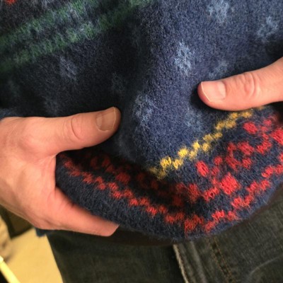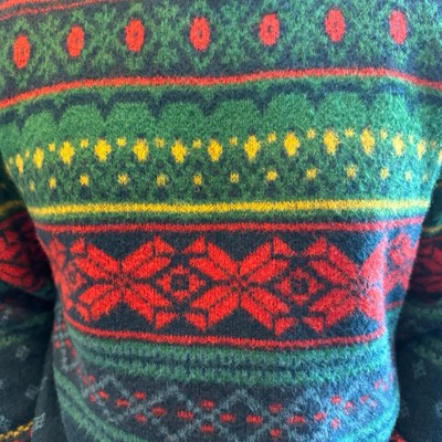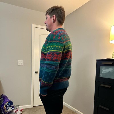 [This review was collected as part of a promotion.] I’m 5’10” and 190 pounds wearing a size large in this pool sweater. This is a very stretchy, and relaxed sweater. The colors are very vibrant, and blend nicely together. This can be worn With jeans, or make it dressy with some dress pants. I liked wearing this to my work Christmas party because it was festive, but also dressy. This was a very warm sweater.
