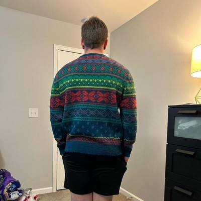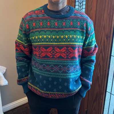 [This review was collected as part of a promotion.] Men’s pullover holiday sweater. Perfect for the holiday season. Crew neck style neck. My husband is wearing a size large. My husband is about 6 foot tall and about 195 pounds. My husband said that this sweater was soft and comfortable, not itchy at all. However sweaters are not really his style as he gets hot very easily. Overall a good quality product
