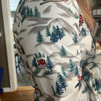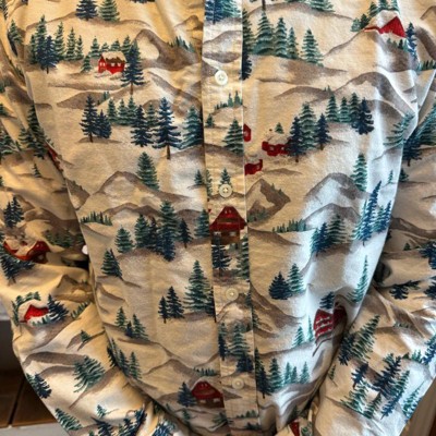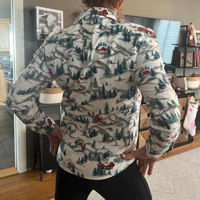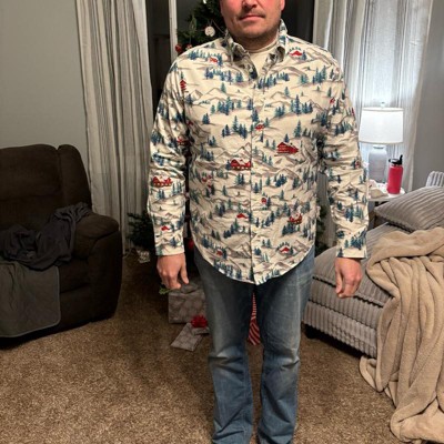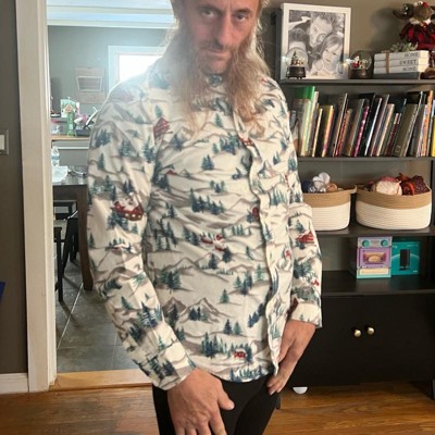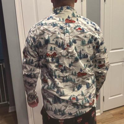 [This review was collected as part of a promotion.] My husband wears a size medium dress shirt. This size medium dress shirt was a little tight on him so I would recommend going one size up. There is such an adorable design on this dress shirt with cabins and a Winter scene. This is a perfect holiday button down for the winter season. My husband said it was very comfortable on and it went great with a pair of jeans.