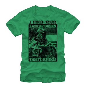 Disappoint Darth Vader and you're going to need more than luck; you'll need the Star Wars Darth Vader Lack of Green Kelly Green T-Shirt! Vader reaches out for a Force choke on the front of this awesome green shirt with "I Find Your Lack of Green Disturbing" printed around him.