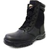 Men's Tactical Boots, black genuine leather and nylon upper, padded tongue and collar, heavy duty side Zipper with Zipper pull stay, full lining, rubber with gripping design system outsole.