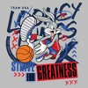 • Strut your stuff with this stylish new men's t-shirt that is perfect for every occasion! Featuring Bugs Bunny passionately playing basketball with red and blue doodles, the franchise name in the background, and the inspirational phrase: "Strive for Greatness" across the front.