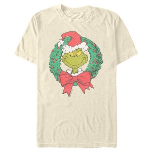 - Celebrate in true Seussical style with this new men's graphic tee that is perfect for the holiday season! Featuring a portrait of a smiling Grinch wearing a Santa hat in a Christmas wreath printed across the front