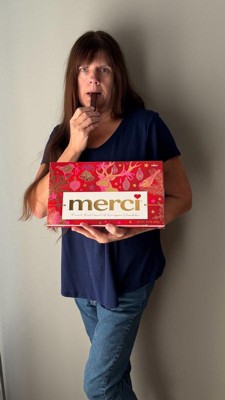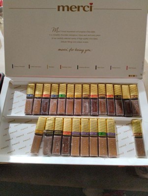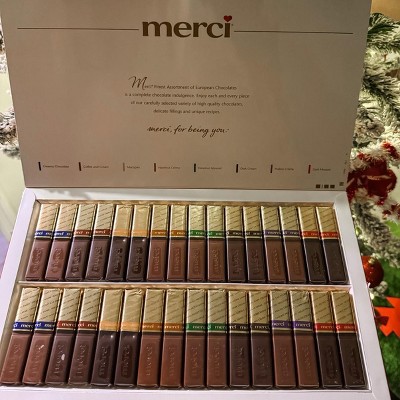 merci Finest Selection of European Chocolates includes 8 flavors of chocolate candy: Milk Chocolate, Hazelnut Almond, Hazelnut Crème, Dark Cream, Dark Mousse, Coffee and Cream, Praline Crème, and Marzipan. merci Chocolate is known as Europe’s famous chocolate gift box, it offers a chocolate for everyone and is sure to be warmly received whether given as gifts or presents, or included in a gift basket, in gift bags or in gift boxes. Our delicious, carefully selected assorted chocolate candy is made in Europe with the finest ingredients. Includes one, 14.1-ounce box of merci chocolates. merci is a delicious alternative to old fashioned Christmas candy. Place a box of merci Chocolate under the Christmas tree or in Christmas stockings to say "Thank you" during the holiday season. Packaging may vary.