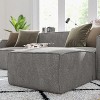 A deep seat and comfy cushion are just the tip of the iceberg on this elevated modular ottoman. Designed to be freestanding as an extra seat or as an accessory piece in multiple configurations with other pieces in the collection, this component is ideal for both large and small spaces. The pocket spring core is covered with comfort foam and premium fabric upholstery with piped edges for a timeless look. Constructed with a solid wood frame, this seat holds up to 300 lbs. static weight and assembly takes less than 10 minutes. Vacuum or lightly brush to maintain the look of this fabulous footrest.
