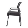 The mesh guest chair with casters, in black, is the perfect addition to any room or office. The chair is at a fixed height with fixed arms and is designed with an upholstered seat and a breathable, airy mesh back. It has a steel tubular frame with hooded double wheel casters that allow smooth movement across many flooring surfaces. The black chair adds a modern, professional appearance to any space and has a weight limit of 275 lbs.