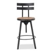 - This barstool boasts a smooth metal seat backing with a wood-like finish that complements the black brush silver metal framework and antique finish firwood seat.