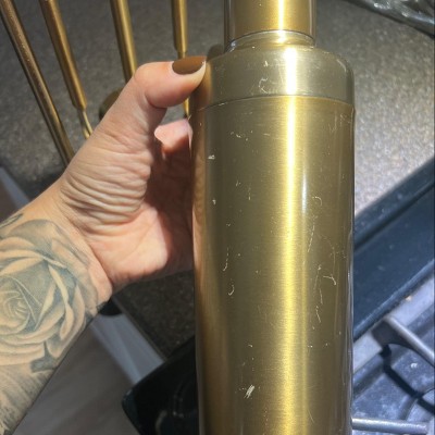 A: The cocktail shaker has a lacquered gold-tone finish.