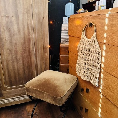 Beautiful design! Heavy and sturdy. Looks vintage with the velvet in brown/yellow color (like a dark gold/ochre). Heavy black iron style legs. Vintage style that goes so well with all of our vintage items in our home. We have used it as a foot rest, guests have sat on it, and as decor near our couch. Only downside is when I was picking one out in the store, I had to really pay attention to the fabric, as one had some scratches and one had a stain. We’ve only had this product a few weeks so I can’t speak to wear and tear but we love it. The one thing I don’t like is that the screws that are on the middle bar have plastic heads, but you have to look close to see. Recommend!
