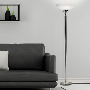 The Metropolis Floor Lamp is a sleek, contemporary style with a dramatic black nickel finish and elegant frosted glass bowl shade. An Adesso patented 300 Watt Double Socket construction allows for two crisscrossed sockets, each holding on/off 150 Watt incandescent or LED bulbs which provides approximately 3 times more light than a typical torchiere. A simple high/low rotary switch is located on the shade cup to adjust the brightness. This lamp has a black cord and is smart outlet compatible. Bulbs are not included. Use incandescent bulbs up to 150W or dimmable led bulbs (DO NOT USE: 3-way bulbs or CFL's)