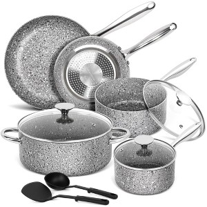 NONSTICK GRANITE POTS AND PANS SET 10 PIECE - This nonstick granite cookware set inlcudes 8-inch frying pan, 10-inch fry pan, 1.5qt saucepan w/cover, 2.5qt saucepan w/cover, 4qt casserole pot w/cover and 2-piece untinsle set. The most common sized-set is suitable for any family or restaurants.