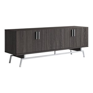 Designed to accommodate TVs up to 65 in., this large TV stand has a modern, mixed-material design and a versatile, neutral finish. It sits on a metal frame with four tapered angled feet. The cabinets are made from strong MDF and PB that's accented by wood grain details for a warm, inviting natural look. Inside the four cabinet doors, two cabinets provide space for board games, media players, and more. Plus, the doors feature strong hinges. We especially love the faux wood details, which ties the whole look together with its distinctive sleek style.