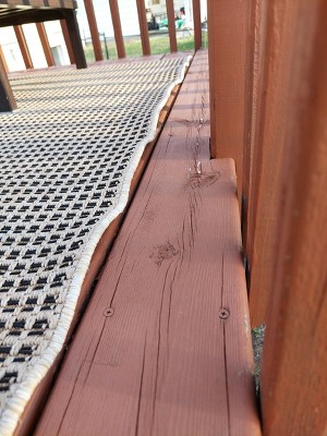 I'm very disappointed with these Threshold outdoor mats. I thought the edges would have relaxed over time but they never did and they are a trip hazard. I have tripped multiple times because the edges along the lengths wavy-curl. I love the feel of the rugs under foot but they really are too hazardous. I did buy plastic strips and corners which do work on the corners but they have not helped with the edges along the length. Because I spent about $105 on the 2 rugs on sale, I will still use them next year but I will buy Carpet tape and tape them together and tape them to the floor. It will not look good but at least I won't have thrown all my money away. I tried to upload two images but this form would not accept them (got a "something went wrong" message)