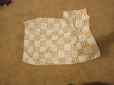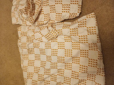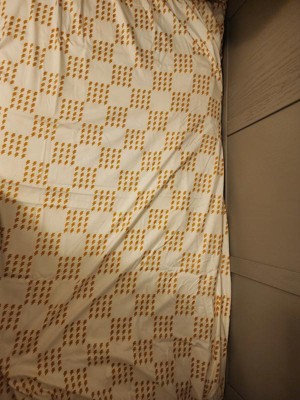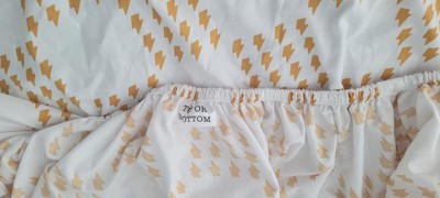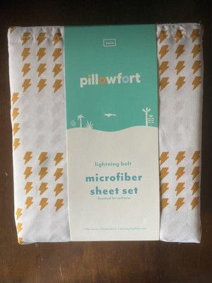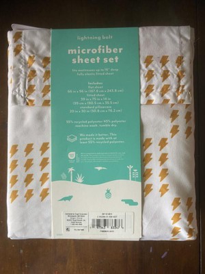 Super cute kids sheet set! I thought it would be white and yellow but its almost more like white and mustard yellow for the lightning bolts! Which are a super cute pattern by the way! It also had labeling on each end of the fitted sheet with "top or bottom" written so it made it super easy to put on or even if you want your kids to put it on they can! It comes with 1 pillow case, i fitted sheet, and 1 loose sheet. It feels like soft like a normal sheet. Its great! Came it a super cute little velcro bag as well.