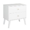 The Prepac Milo 2-Drawer Nightstand is a modern take on a retro look, with a sleek mid-century modern design that adds a touch of vintage styling to your bedroom. Two full sized drawers provide ample room for all your bedside necessities, keeping the area around your bed organized. The tapered solid wood legs and inset drawers deliver a clean and modern look to your bedroom. Brushed brass finished knobs add to the retro-chic design of this functional and fashionable nightstand. Style this nightstand on its own, or combine it with any of the products in the Milo collection for a timeless look. Constructed from non-toxic, CARB-2 compliant, laminated composite woods. Ships Ready to Assemble, includes an instruction booklet for easy assembly and has a 5-year manufacturer's limited parts warranty. Manufactured in Canada and meets all North American safety standards.