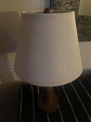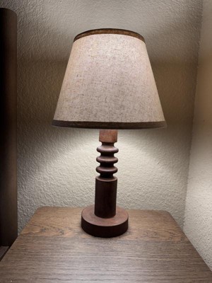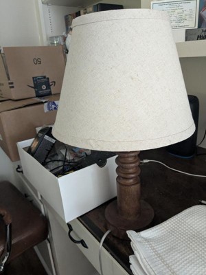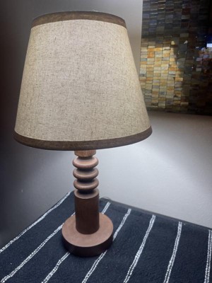 This medium tone wood lamp is really great quality. It is a smaller style lamp. The lamp shade is a lighter brown textured burlap style that goes well with the base. It provides good light even though it’s small.