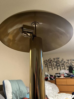 Bring soft lighting and timeless elegance to your space with the Mild Steel Floor Lamp from Threshold™. Standing tall at 63.25 inches, this mild steel floor lamp boasts a sleek frame paired with a round base and bowl-shaped shade in a brass finish for a polished look. Designed with a push-button foot switch and a 11.48-foot power cord, you can place this floor lamp next to your armchair or sofa to brighten up your space.