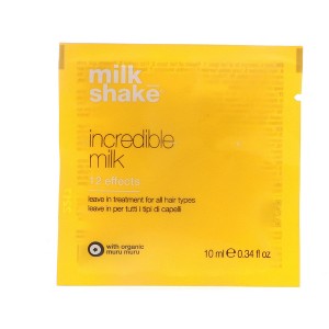 Milk_Shake Incredible Milk 12 Effects Leave-In, 0.34 oz, is a compact leave-in treatment spray that delivers 12 amazing hair benefits in a convenient travel size. It hydrates, repairs, detangles, adds shine, controls frizz, and protects from UV and heat styling. Enriched with organic fruit extracts, milk proteins, and vitamin-rich botanicals, it enhances overall hair quality even with limited use. A great option for sampling or on-the-go touch-ups and styling care.