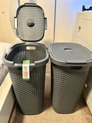 [This review was collected as part of a promotion.] I got Mind Reader Basket Collection, Slim Laundry Hamper, 60 Liter 2 pack for my room and our sons room. They have been exactly what we needed for our lack of space, but the basket still holds a lot. The baskets are lightweight but sturdy. Even whennthe basket is overflowing full I can still carry it downstairs. The baskets have a woven texture, even though its plastic. It really is a nice looking laundry basket, and i dont mind have it out in the open. The lid makes it nice to hide the "unmentionables" away. I am very happy with my Mind Reader Basket Collection, Slim Laundry Hamper. The only thing I wish could be added are wheels.