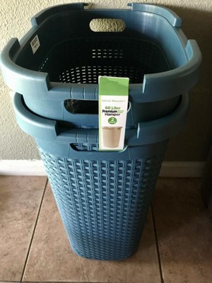 [This review was collected as part of a promotion.] I love these Mind Reader Basket Collection, Slim Laundry Hamper, 60 Liter (15g/33lbs) Capacity. The basketweave design of hampers are awesome. I love the blue color too. These look really great in my home and are super convenient . I am currently using one for laundry and the other for storing hay for my pet rabbit. The lid opens easily and the handles make is very easy to transport.