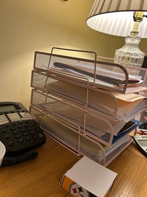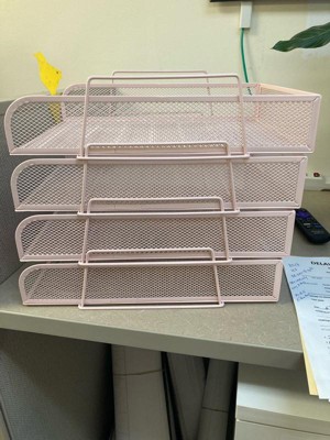 [This review was collected as part of a promotion.] First, I love this pink color! It matches my keyboard and mouse. Secondly, and perhaps more importantly, this is a sturdy little file organizer. It’s made of metal so it is a solid piece. 4 shelves suits my needs. This is so much better than the plastic one it replaced!