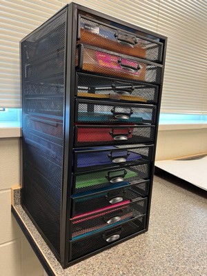 [This review was collected as part of a promotion.] I am a teacher and have a workspace with a desk at home in my spare bedroom. This metal mesh storage drawers fits perfectly on top of a little shelf I have, and it stores my office supplies very neatly. I love that I can easily see what I put inside without having to open each drawer. You can also label the drawers if you want to but I prefer not to. It's a great size and would also fit nicely under my desk if I wanted to bring it down lower. It would also fit a small printer on top if I wanted to set it on the ground. It fits supplies and papers! I love it.