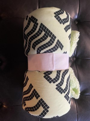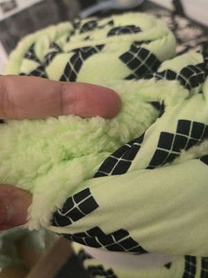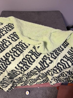 Such a cute throw blanket for any gamers room. It has a sherpa lining on the inside that keeps you warm. The side with the wording is very soft to the touch. It’s the size of a regualar throw blanket but my adult daughter uses it fine. The only thing she said would have made it better is it had glowed in the dark!