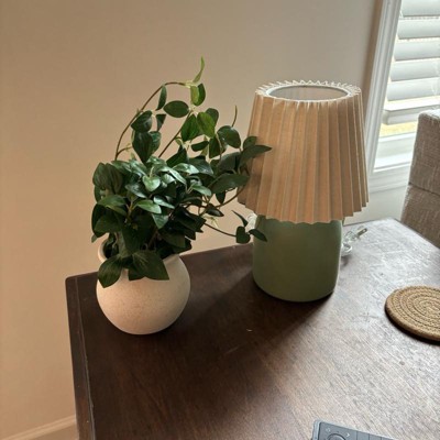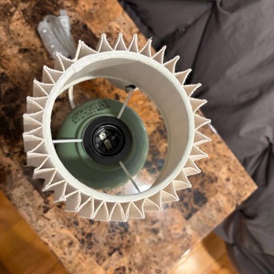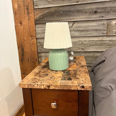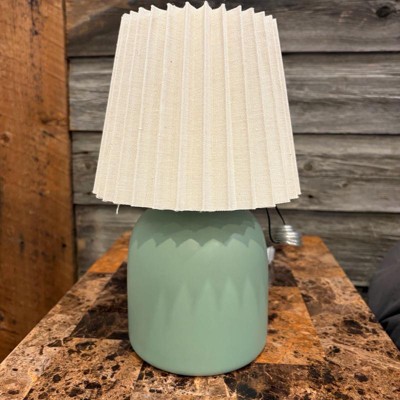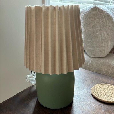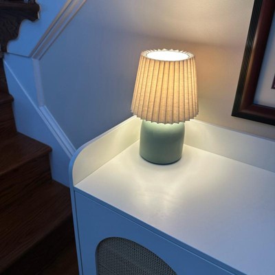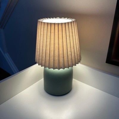[This review was collected as part of a promotion.] What a wonderful mini green ceramic green lamp. This lamp is quite the cute and unique lamp. I love the sage green ceramic base. It looks high end and takes the look of the room up another level. I also really like the pleated lap shade. Ten out of ten. This would make a fantastic bed side lamp or end tables