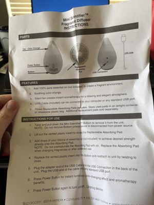 What a cute mini scentifier fan diffuser. It comes with three filters and a bottle of orange essential oil. There is enough oil to soak one filter. The bottom twists off easily to apply oil. There is a USB power cord and a on/off button. Seeing as this is mini size it will work best in a small room. I do have mine in my living room and it will hold up for a day. I have forgotten to turn it off and haven't noticed any over heating. The top also changes colors.