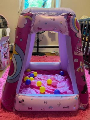 It's time to have a ball with Minnie Mouse! This easy to inflate playland includes 15 soft flex balls for plenty of tossing or game fun. The open ball-toss roof and crawl-through design are perfect for young adventurers. Bright character graphics will keep your child entertained for lots of imaginative fun. Toss, play, and crawl with Minnie Mouse!