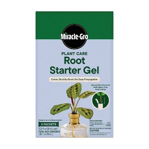 Propagate your favorite plant babies with Miracle-Gro® Plant Care Root Starter Gel. New plants need the best possible growing environment, and this rooting gel grows healthy roots for easy propagation. Formulated with an essential hormone for enhanced root development, this root starter promotes thicker, healthier roots for propagation success*. You can use it with stem or leaf cuttings from a variety of houseplants, including prayer plants, croton, Christmas cactus, jade plants, monstera, pothos, philodendron, snake plants, fiddle leaf fig, rubber plants, succulents, and zz plants. Whether you prefer to start your plants in water or directly in soil, this rooting gel can help speed root growth. For a mess-free application, simply open a packet, dip your cutting in the gel, then place your cutting in a vessel of water or a pot of soil. If propagating in water, top off water as needed, ensuring new roots stay submerged. If propagating in soil, keep the soil moist until roots are well-established. Each packet in this 4-pack box propagates up to 5 cuttings. *vs untreated plants