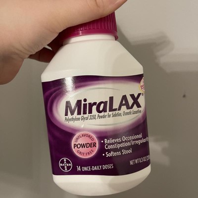 When occasional constipation slows you down, MiraLAX laxative powder works naturally with the water in your body to hydrate and soften your stool without harsh side effects like gas, bloating, cramping or sudden urgency. Unlike stimulant laxatives that force movement by stimulating nerves in the colon, MiraLAX laxative polyethylene glycol 3350 powder draws water into the colon to unblock your system gently and effectively. MiraLAX is designed to work with your body, supporting your backed up gut along the way. Providing predictable constipation relief in 1-3 days without the harsh side effects of stimulant laxatives. Taking MiraLAX is easy, the flavor-free, grit-free powder dissolves seamlessly into any hot or cold beverage, from water and juice to coffee and tea. And because it’s free from sugar, preservatives, and gluten, you can feel good about choosing a gentle laxative for constipation that fits your lifestyle. A reliable choice among stool softeners for women and men, making it one of the go-to laxatives that will gently relieve your constipation.
